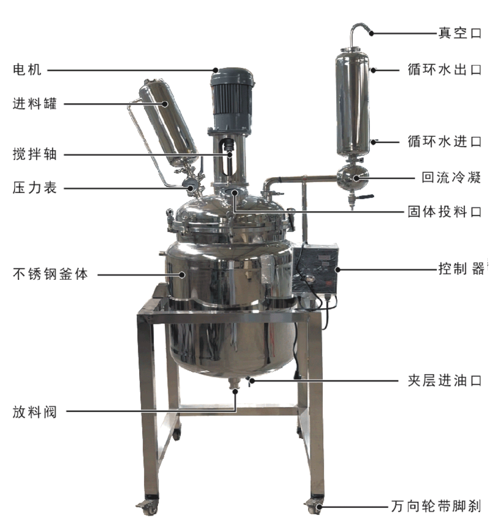 ,在密閉的不銹鋼反應器內,可根據使用要求在常壓或負壓條件下進行攪拌反應,并能做反應溶液的回流與蒸餾。