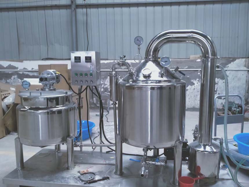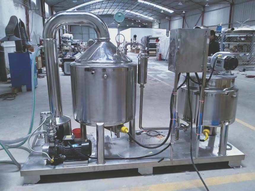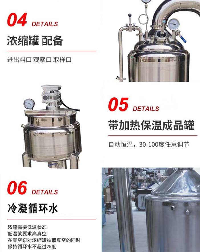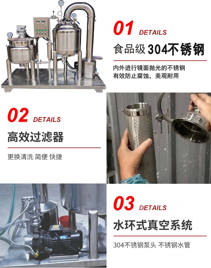 1 .設(shè)備由預(yù)熱罐、過(guò)濾器、濃縮罐、冷凝器、回收罐、真空泵部件組成,結(jié)構(gòu)緊湊,占地面積小。